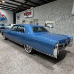 This 1965 Cadillac Fleetwood Sixty Special sedan remained with the original owner’s family until 2024 and was later refurbished with a repaint in Corinthian Blue Metallic over its original Hampton Blue Metallic finish. The exterior presents with the dignified, formal styling expected from Cadillac’s premium sedan of the mid-1960s, including vertically stacked quad headlights, extensive chrome trim, rear fender skirts, cornering lights, and Kelsey-Hayes 15-inch wire wheels fitted with whitewall tires. The body retains strong visual presence, and while minor trim imperfections and bumper pitting are noted, the car still carries the elegant road presence that defined Cadillac during this period.