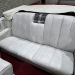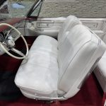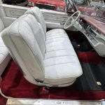 Inside, the cabin is upholstered in white leather over the front and rear bench seats, paired with red carpeting for a dramatic and upscale contrast. Features include a power-adjustable front bench, power windows, power door locks, push-button radio, Guide-Matic automatic headlight dimmer, compass, and a tilting and telescoping steering column with a Cadillac crest wheel. Instrumentation is classic Cadillac, with a horizontal 120-mph speedometer flanked by fuel and temperature gauges. The rear speaker and clock are noted as non-functional, but the interior remains spacious, luxurious, and highly appealing. This DeVille Convertible is a strong example of 1960s Cadillac glamour, blending open-air elegance, big-block V8 power, and unmistakable American prestige.